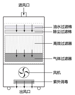 2.主過(guò)濾層過(guò)濾梯度設(shè)置:初中效過(guò)濾+HEPA高效過(guò)濾。凈化顆粒直