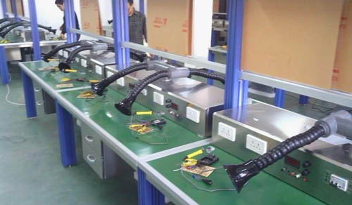 | 外排和室內(nèi)凈化簡述: (1):外排方式: 整體布管根據(jù)實際情況使用不同的風機,通過分次布管接到各個焊錫工位,通常主管直徑在30CM左右,分到次管直徑為5CM到10CM之間,前面也需要加上喇叭口之類的吸煙罩以達到更好的吸煙效果,風機功率在7.5千瓦左右。一個7.5千瓦風機能帶上20個左右焊錫工位![煙霧凈化器] (2):通過煙霧凈化設(shè)備凈化后直接在室內(nèi)排放: 采用煙霧凈化設(shè)備直接將煙霧廢氣完整的吸過來,經(jīng)過凈化處理達室內(nèi)空氣質(zhì)量標準,可直接在室內(nèi)排放。